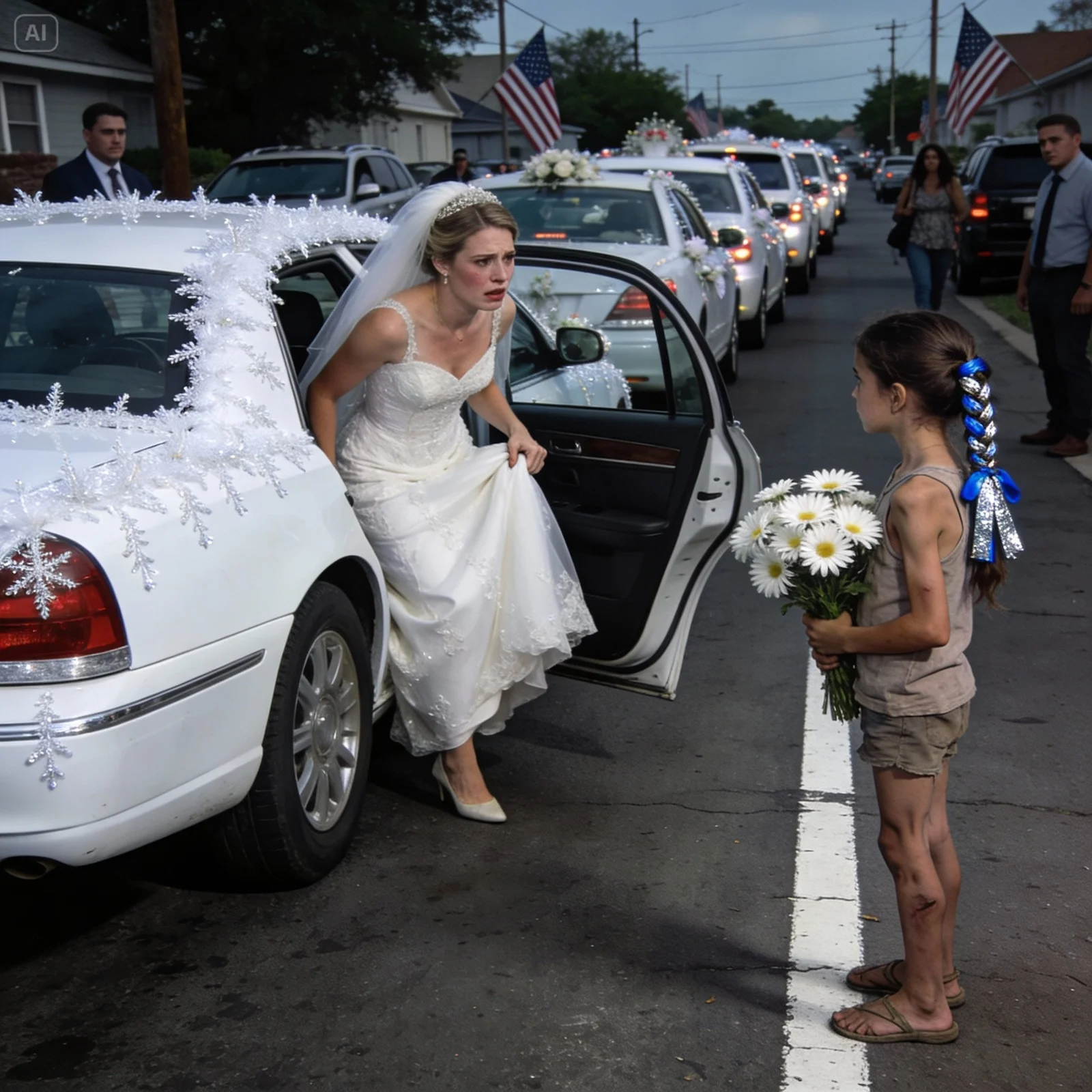 A little girl approached my wedding motorcade holding a bouquet of daisies and asked for a few coins. The cars were stopped at a red