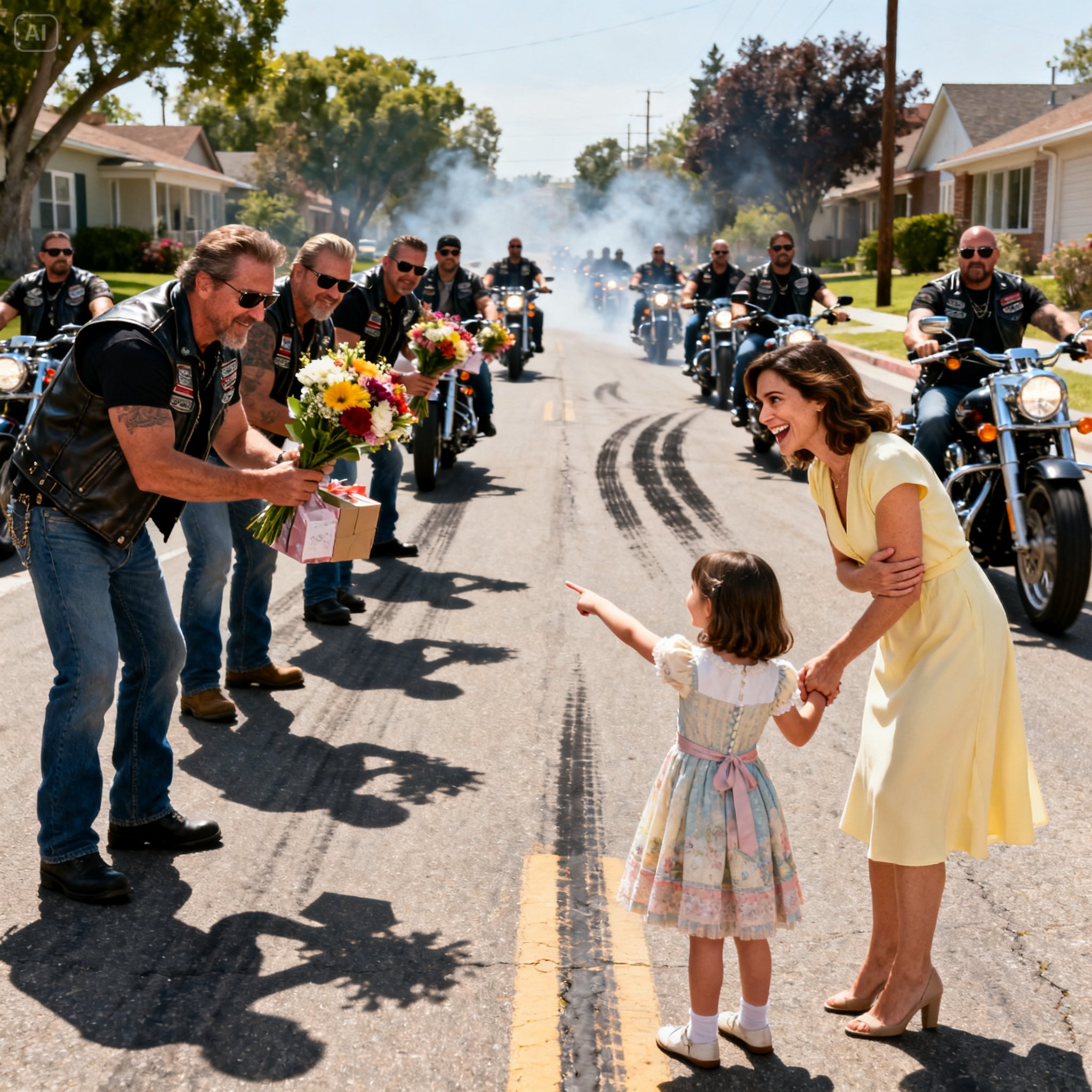 The bikers—mostly rough-looking men in worn leather and tattoos—took their cue from Lily. They knelt, made silly faces, and handed her cupcakes as if they