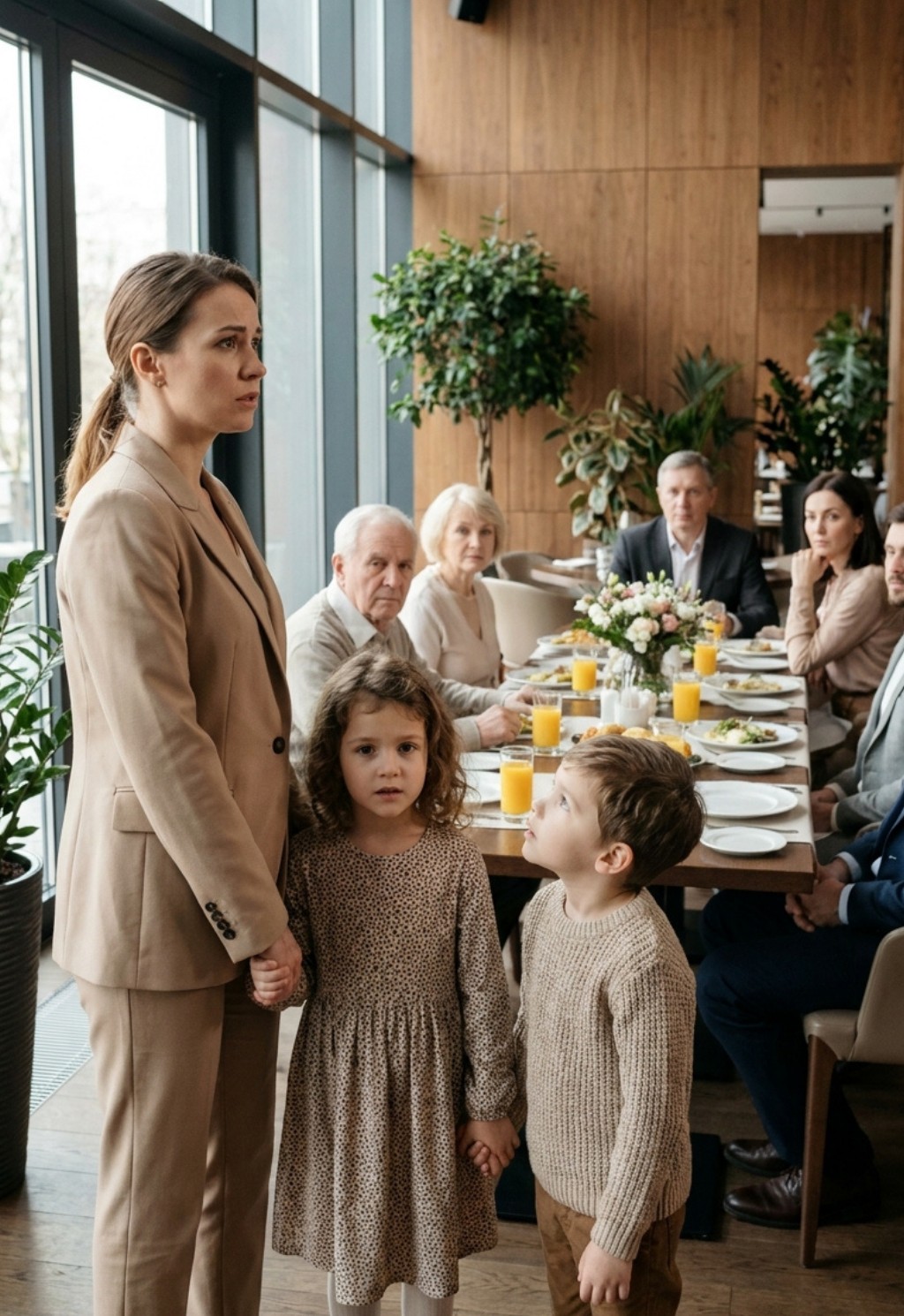 To me, everyone included my two children. Toby, who was seven and prone to anxiety in loud spaces, squeezed my hand the moment those words hit the air. Beside him, little Maisie tucked herself behind my cardigan, her wide eyes darting around as she sensed the sudden, sharp shift in the atmosphere.